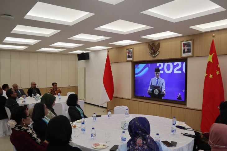 Suasana nonton bersama Pernyataan Pers Tahunan Menteri Luar Negeri (PPTM) 2026 di KBRI Beijing, Kamis (14/01/2026). (ANTARA/Desca Lidya Natalia)Hubungan Indonesia dan China, menurut Parulian, secara tradisional adalah di bidang ekonomi.